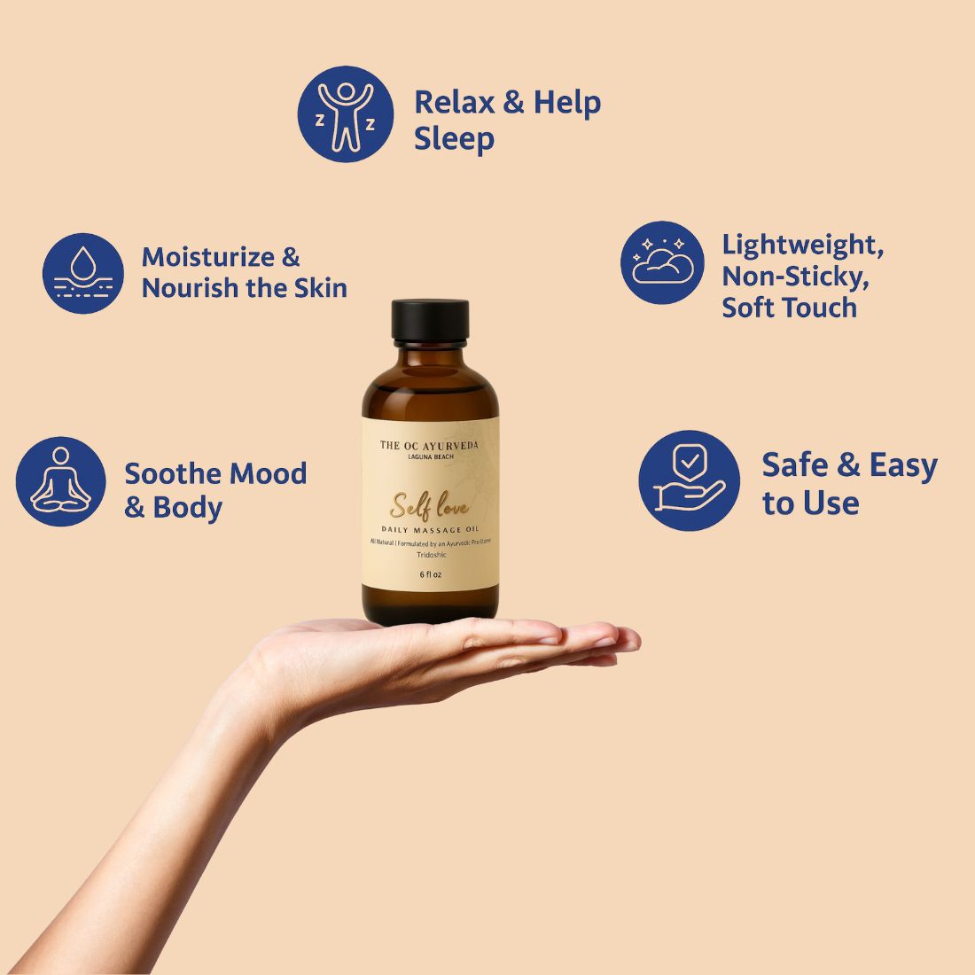 Nourish your body, calm your mind, and reconnect with yourself through the ancient wisdom of Ayurveda. Self Love – Daily Massage Oil is a luxurious blend of organic herbs and botanicals, carefully infused in sesame oil to restore balance, vitality, and a sense of inner peace.